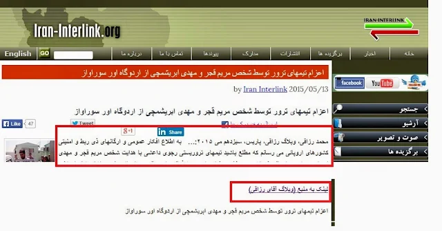 ايران اينترلينك درتاريخ 13 مي 2015 برابر با 23 ارديبهشت 94 مطلبي به نام “اعزام تیمهای ترور توسط شخص مریم قجر و مهدی ابریشمچی از اردوگاه اور سوراواز-محمد رزاقی، وبلاگ رزاقی، پاریس، سیزدهم می ۲۰۱۵:… به اطلاع افکار عمومی و ارگانهای ذی ربط و امنیتی........“درج كرده است .