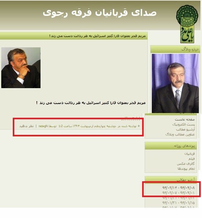 ولي هم چنان كه دركليشه پايين ملاحطه ميكنيد ، وبلاگ محمد رزاقي به نام “صداي قربانيان فرقه رجوي “ از تاريخ 4 مي 2015 برابربا 14 ارديبهشت 94 بروز نشده وهيچ مطلبي روي آن گذاشته نشده است .